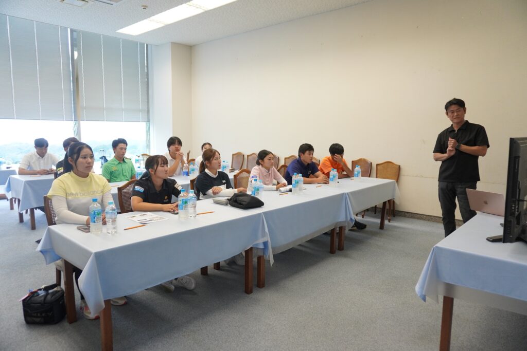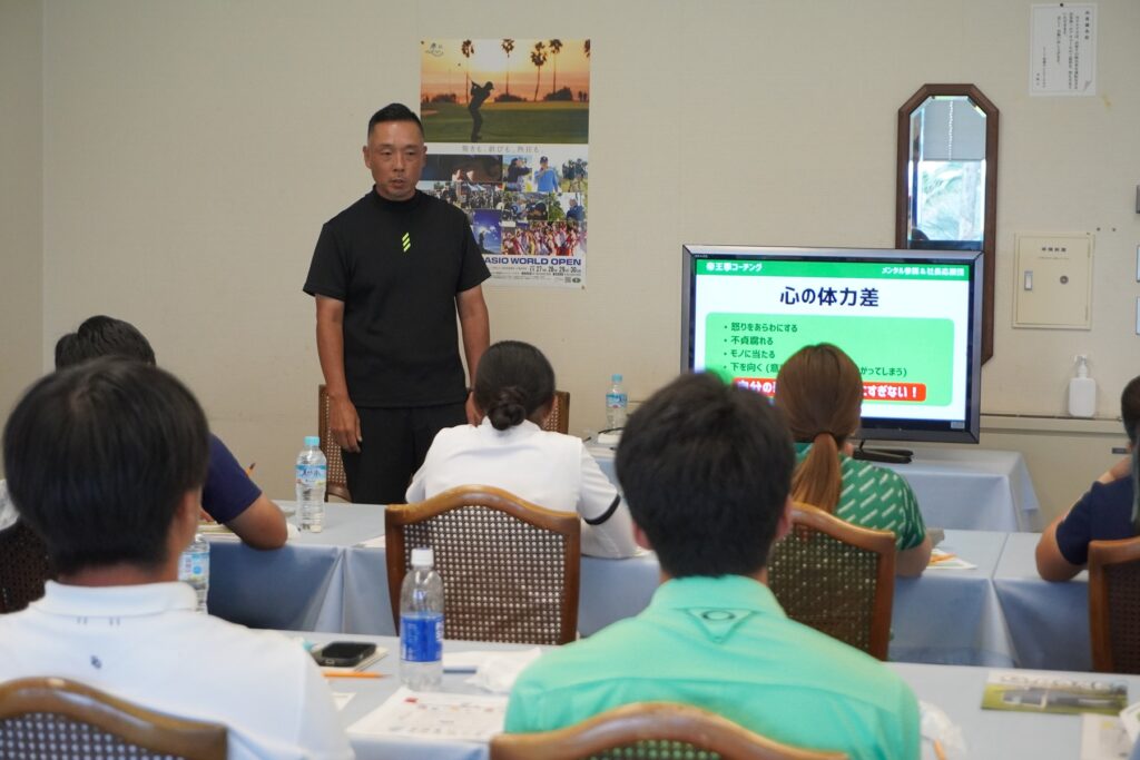 午後には、元プロ野球の審判という異色の経歴で、プロゴルファーやジュニアゴルファーをはじめさまざまなスポーツ選手のメンタルアドバイザーを務める丹波幸一氏によるメンタルトレーニングが3時間にわたって行われました。統計学データに基づいた科学的なアプローチと、プロ選手の実例を交えた実践的な内容で構成された講演は、参加者全員から「とても有用」との評価を受けました。アンケートでは「実践的な内容で即活用できる技術を習得できた」「プロ選手の実例が参考になった」という声が寄せられました。