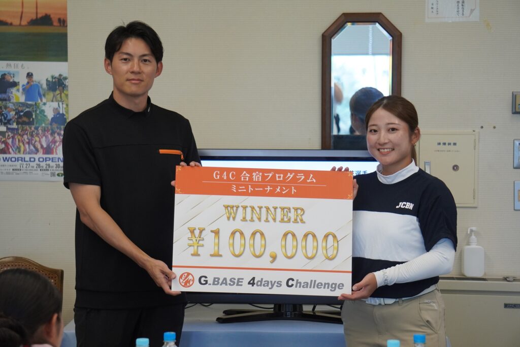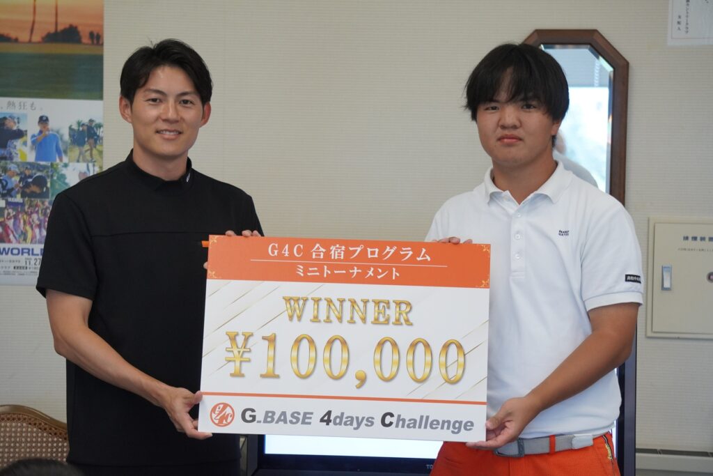 合宿2日目のメインイベントは、賞金とG4C本戦への出場権をかけたミニトーナメント。18ホールのストロークプレーで行われたこの大会では、実際に賞金がかかることもあり、本番さながらの緊張感のなかで各選手が真剣にプレーを行いました。前半1打差で追随する選手が現れるなど白熱した展開も見られました。また、2日目で6打もスコアを縮めた選手もおり、短期間での成長もみることができました。